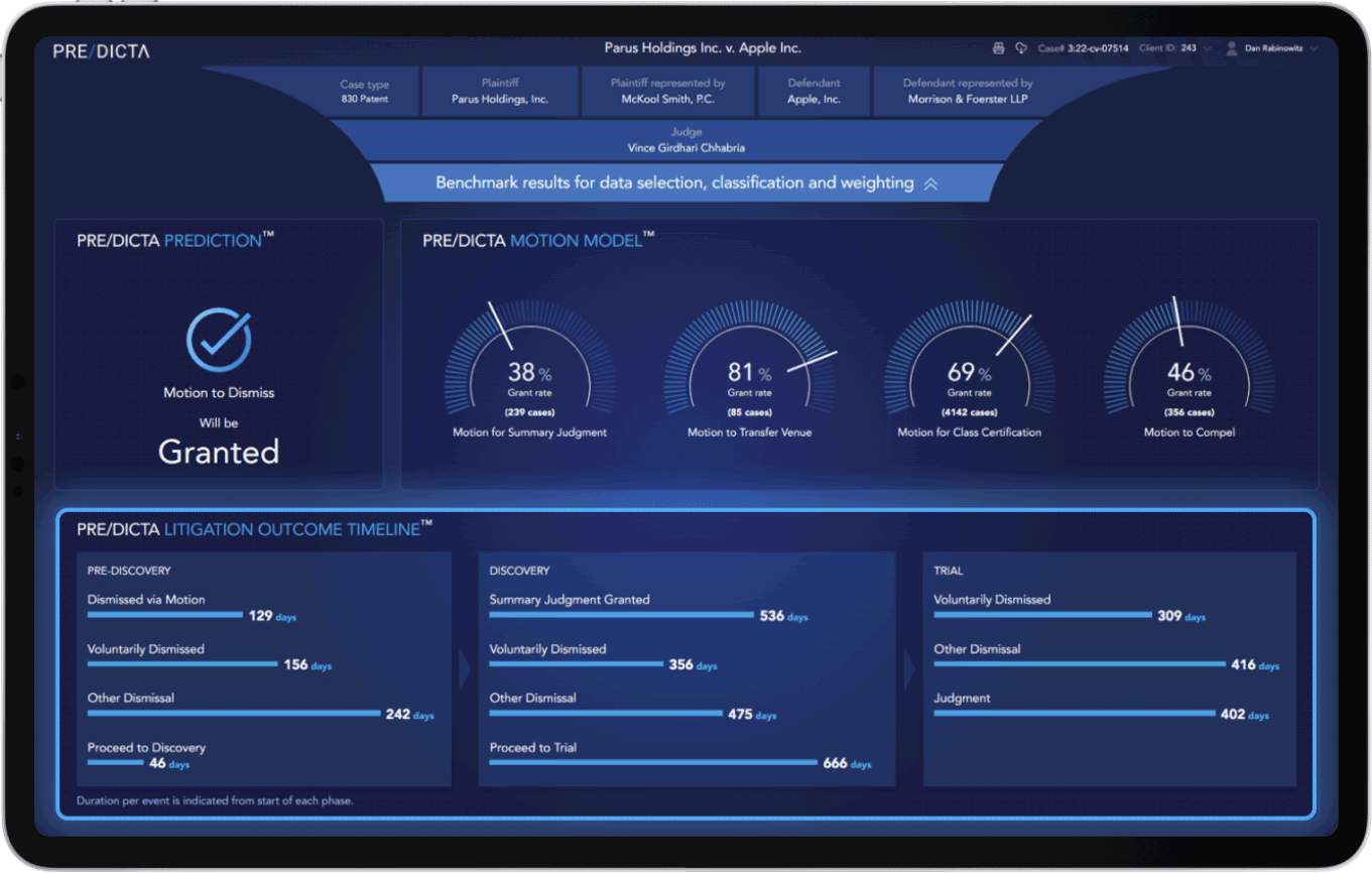 Pre/Dicta’s proprietary algorithms use artificial intelligence to uncover judicial patterns. We’re told that its predictions are 85% accurate for motions to dismiss across all 94 U.S. federal district courts. The newly released augmented capabilities provide insights into additional motions through AI data-profiling. These include the most consequential motions: summary judgment, class certification, and venue transfer.